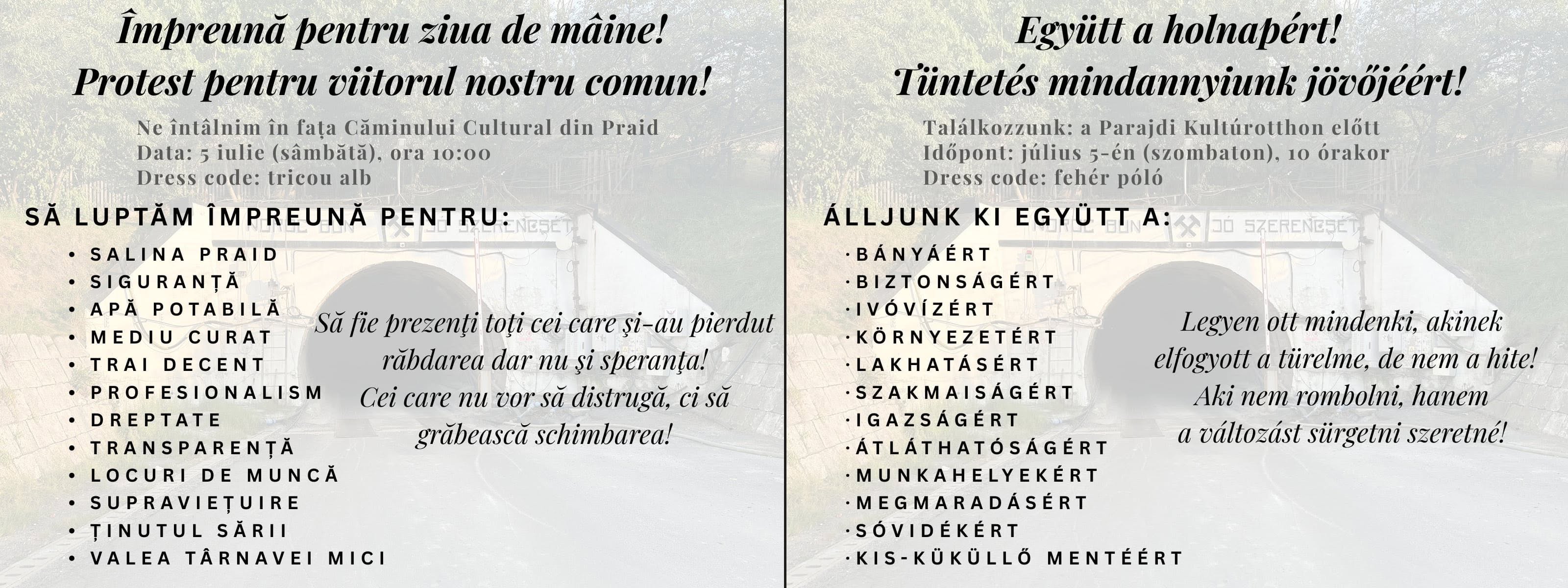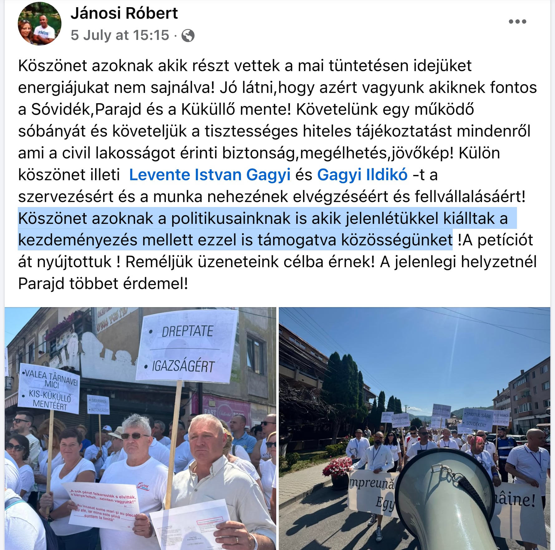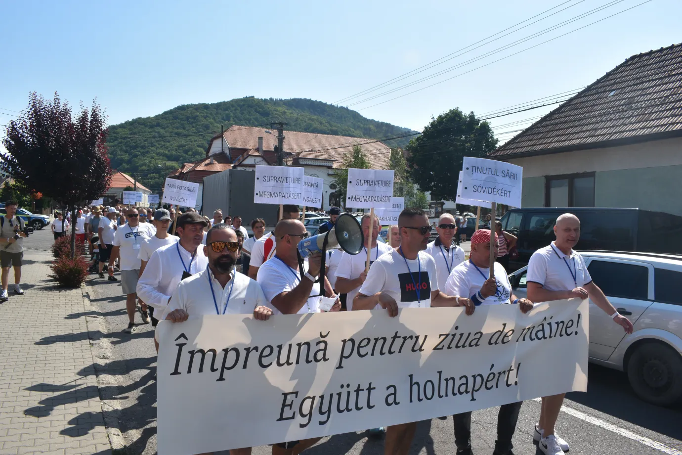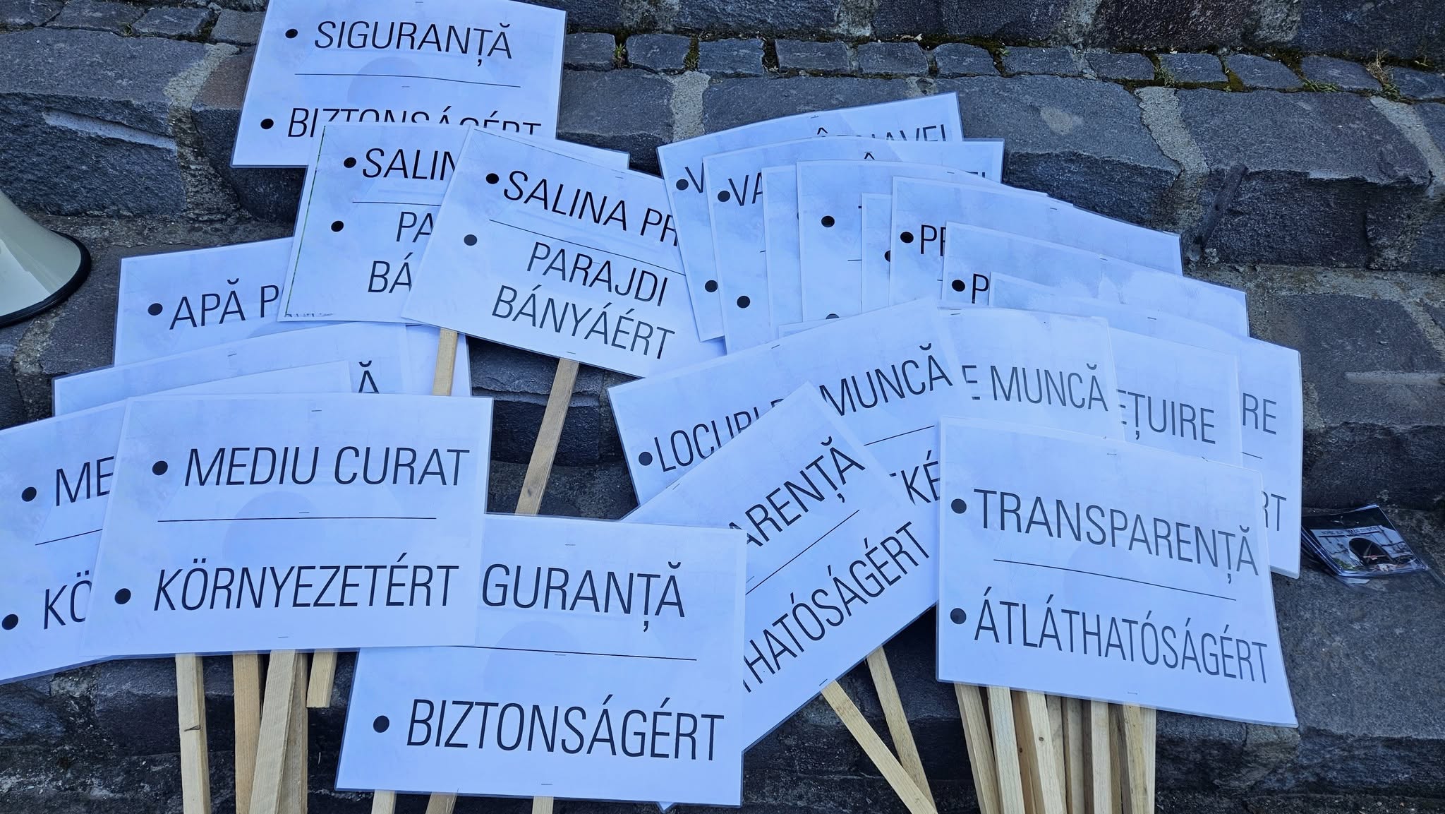 A helyszínen egyre több transzparens került elő, olyan feliratokkal, mint „Tiszta vizet!”, „Biztonságot Parajdnak!”, „Mondjon le a bányaigazgató!”.