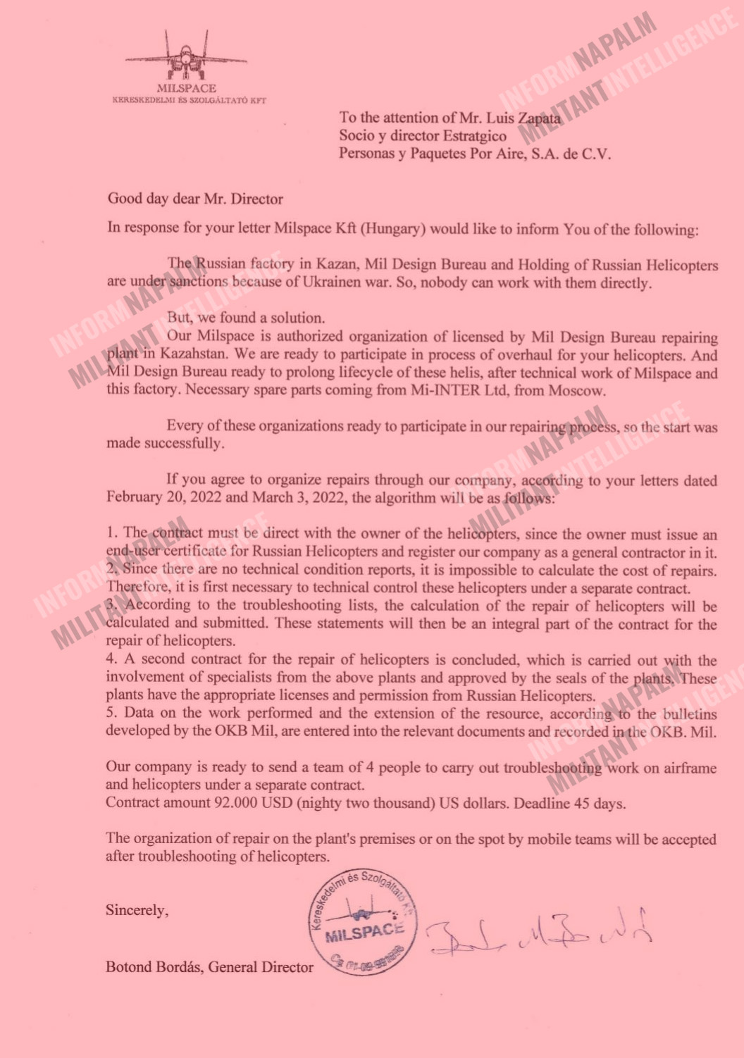 „Our company is ready to send a team of 4 people… Contract amount 92.000 USD… Deadline 45 days.” Ez egy világos pénzügyi tétel: a magyar cég 92.000 dollárért vállalja a helikopterek hibaelemzését. Ez a dokumentumban szereplő összeg megegyezik az InformNapalm cikkeiben említett adattal.